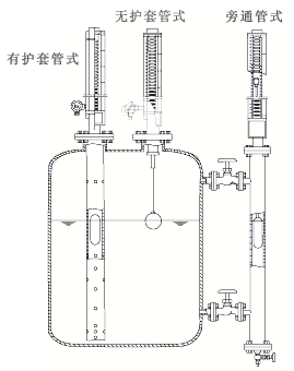 ◆在容器從不適宜側(cè)面開(kāi)孔及容器周?chē)臻g很少時(shí),可在容器上部或下部安排本形式的液位計(jì)。