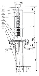 B:貯藏接口頸高 L:量程范圍 L1:盲區(qū) L0:最大插入深度 1、排空絲堵 2、主體管 3、顯示器 4、磁性翻柱 5、連接法蘭 6、頂桿 7、護(hù)導(dǎo)管 8、浮球組件 | 盲區(qū)L1(mm)介質(zhì)密度g/m36500.45~0.064000.61~0.743800.75~0.853500.86~1.103301.11~1.253001.26~1.392501.40~1.592001.60~2.00 |