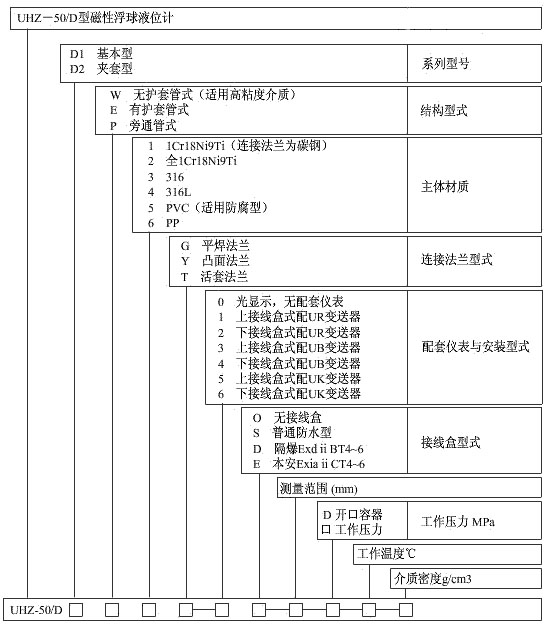 UHZ-50/D型系列頂裝式磁性浮球液位計(jì)常用規(guī)格型號(hào)