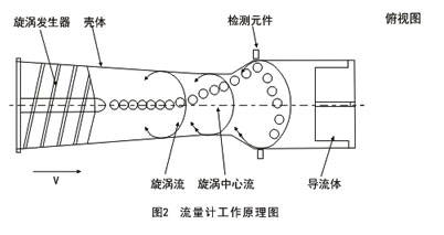 當(dāng)流體通過螺旋形導(dǎo)流葉片組成的旋渦發(fā)生體后,流體被強(qiáng)迫繞旋渦發(fā)生體中心劇烈地旋轉(zhuǎn),形成旋渦流。旋渦流加速,沿流動方向經(jīng)縮徑段,流動強(qiáng)度增強(qiáng)。當(dāng)旋渦流進(jìn)入擴(kuò)散段后,在導(dǎo)流體回流的作用下,該旋渦產(chǎn)生二次旋轉(zhuǎn)運(yùn)動,即旋渦進(jìn)動。二次旋渦進(jìn)動的頻率與流量成正比。當(dāng)流量計設(shè)計得當(dāng)時,在很寬的流量范圍內(nèi),旋渦的頻率與流量成線性關(guān)系。該頻率由壓電傳感器檢測,由流量積算儀進(jìn)行運(yùn)算和處理。