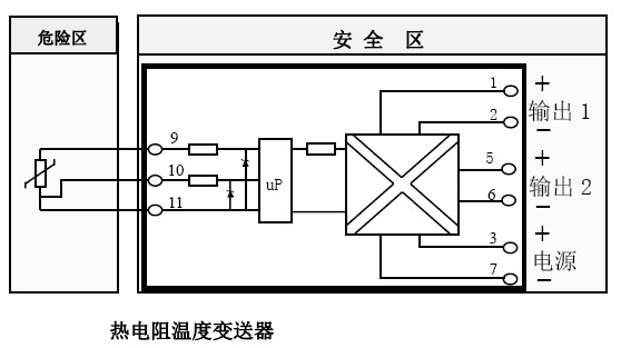 2. 熱電阻溫度變送器通往現(xiàn)場(危險場所)的軟銅導(dǎo)線截面積必須大于0.5mm2。