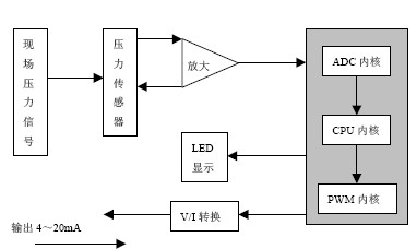 儀表通過(guò)壓力傳感器把壓力信號(hào)變?yōu)殡娦盘?hào),再由前置放大器把此電信號(hào)放大濾波,送往CPU的A/D轉(zhuǎn)換模塊進(jìn)行模擬量到數(shù)字量的變換。最后由CPU進(jìn)行數(shù)據(jù)處理并顯示及PWM輸出。原理框圖如下: