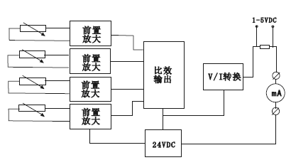 ◆自熱電阻傳感器的測量信號通過前置放大器放大,然后被比較輸入電路(選擇高溫信號)或選點輸入電路選中某一路信號,該信號通過電壓/電流(V/I)轉(zhuǎn)換單元將放大器的輸出電壓變?yōu)?-20A恒定電流輸出,原理方框圖如下圖所示: