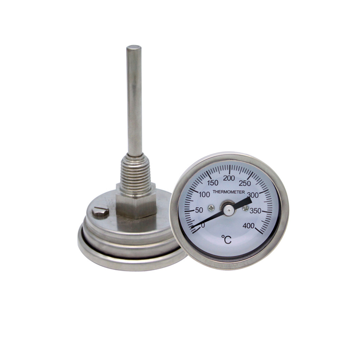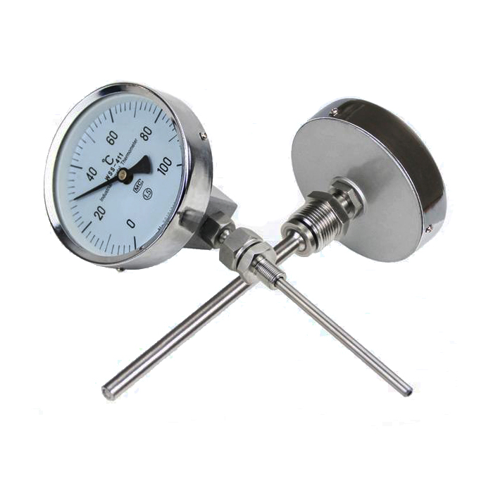 工業(yè)用雙金屬溫度計(jì)主要的元件是一個(gè)用兩種或多種金屬片疊壓在一起組成的多層金屬片。為提高測(cè)溫靈敏度,通常將金屬片制成螺旋卷形狀。當(dāng)多層金屬片的溫度改變時(shí),各層金屬膨脹或收縮量不等,使得螺旋卷卷起或松開。由于螺旋卷的一端固定而另一端和一可以自由轉(zhuǎn)動(dòng)的指針相連,因此,當(dāng)雙金屬片感受到溫度變化時(shí),指針即可在一圓形分度標(biāo)尺上指示出溫度來。這種雙金屬溫度計(jì)儀表的測(cè)溫范圍是200~650℃,允許誤差均為標(biāo)尺量程的1%左右。