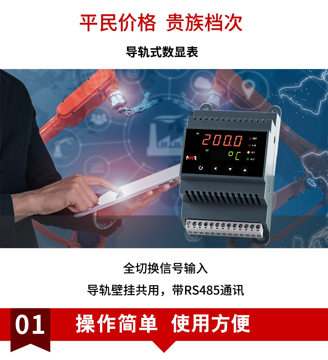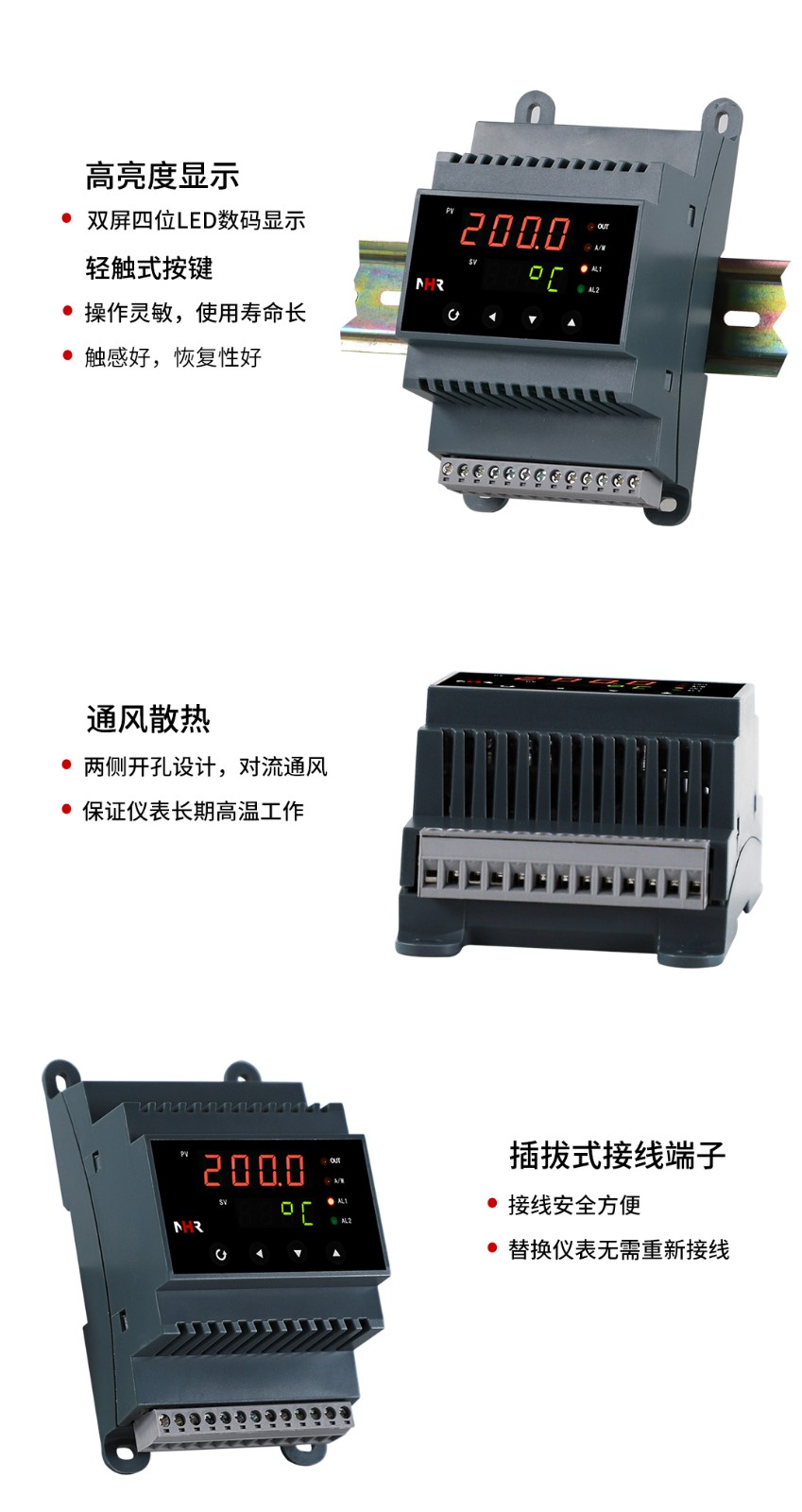 NHR-DN10系列導(dǎo)軌式數(shù)字顯示控制儀采用了表面貼裝工藝,全自動(dòng)貼片機(jī)生產(chǎn),具有很強(qiáng)的抗干擾能力??蓪?duì)溫度、壓力、液位等工業(yè)過程參數(shù)進(jìn)行測(cè)量、顯示、報(bào)警控制、變送輸出、數(shù)據(jù)采集及通訊。