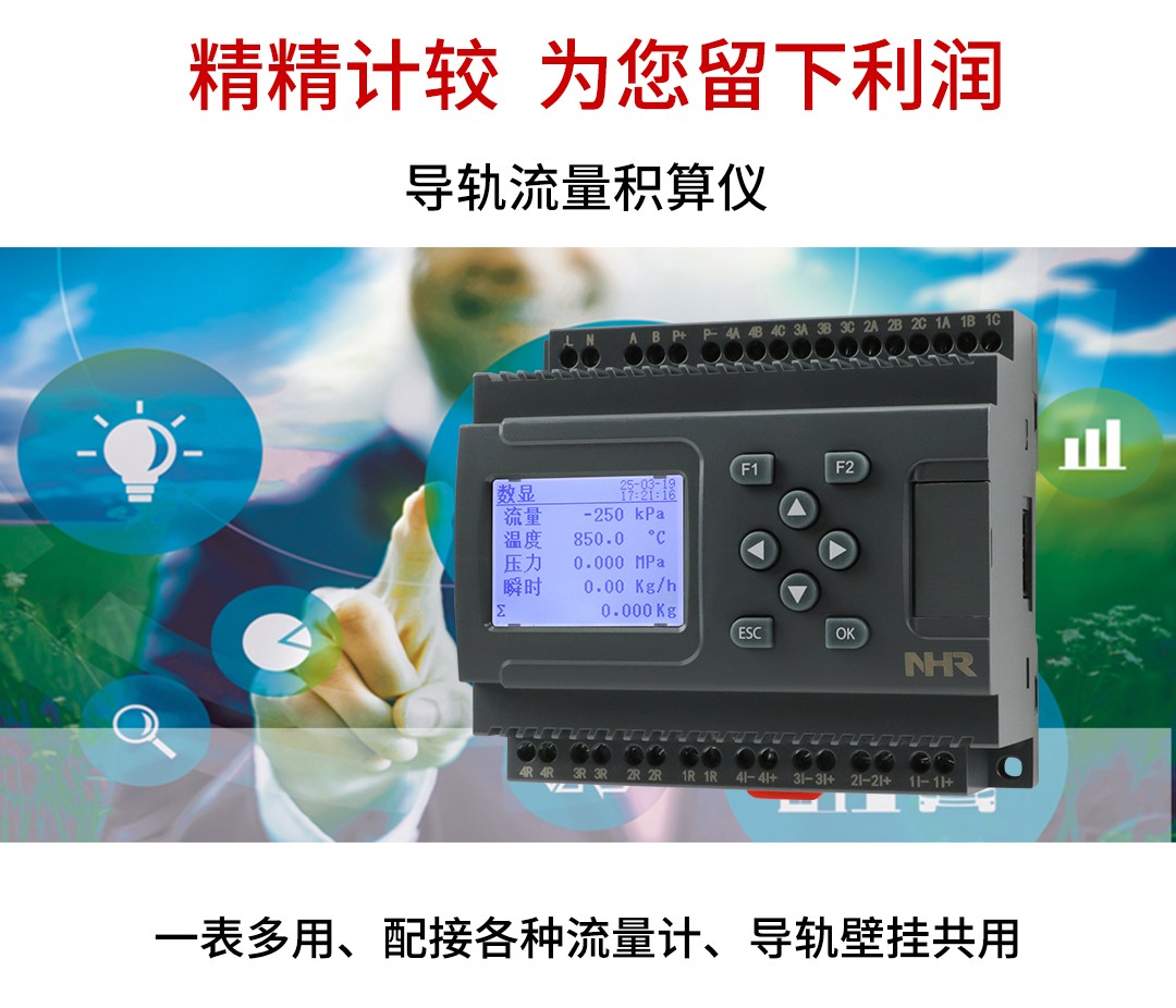 NHR-DN60系列導(dǎo)軌流量積算儀接收來自流量傳感器信號(hào)(差壓、脈沖等)、溫度、壓力傳感器的補(bǔ)償信 號(hào)實(shí)現(xiàn)對(duì)氣體、熱水和蒸汽流量進(jìn)行過程監(jiān)測,總量累積及定量控制。